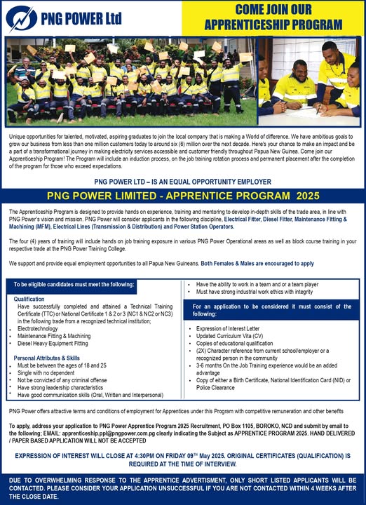Address your application to: PNG Power Apprentice Program 2025 Recruitment, P.O Box 1105, Boroko, NCD.